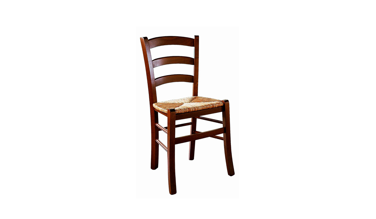 Sedia dal taglio classico con robusta struttura in legno e seduta in paglia, disponibile anche con seduta legno