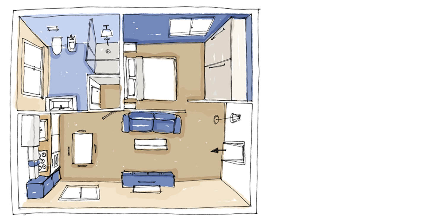 Il risultato finale è un monolocale accogliente e luminoso, grazie all’accostamento capace di colori, arredi su misura salvaspazio e complementi d’arredo. Uno spazio dove vivere comodamente la quotidianità e ricevere gli amici.